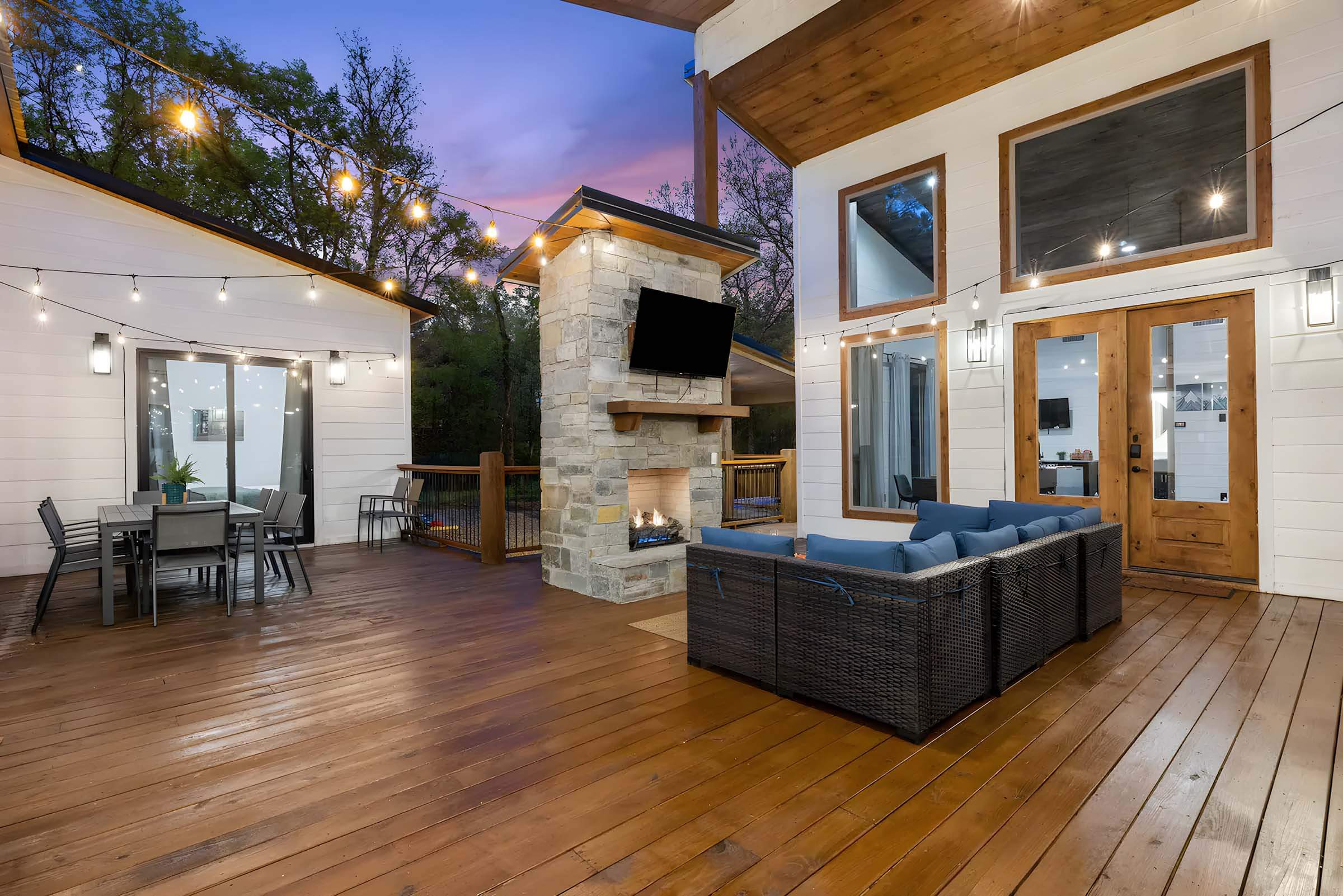 As you step into your home away from home and you’ll be greeted by a spacious open-plan living area with vaulted ceilings and a beautiful fireplace, providing a cozy atmosphere for chilly evenings. Marshmallow Bliss is charming & modern and accommodates up to 17 guests.